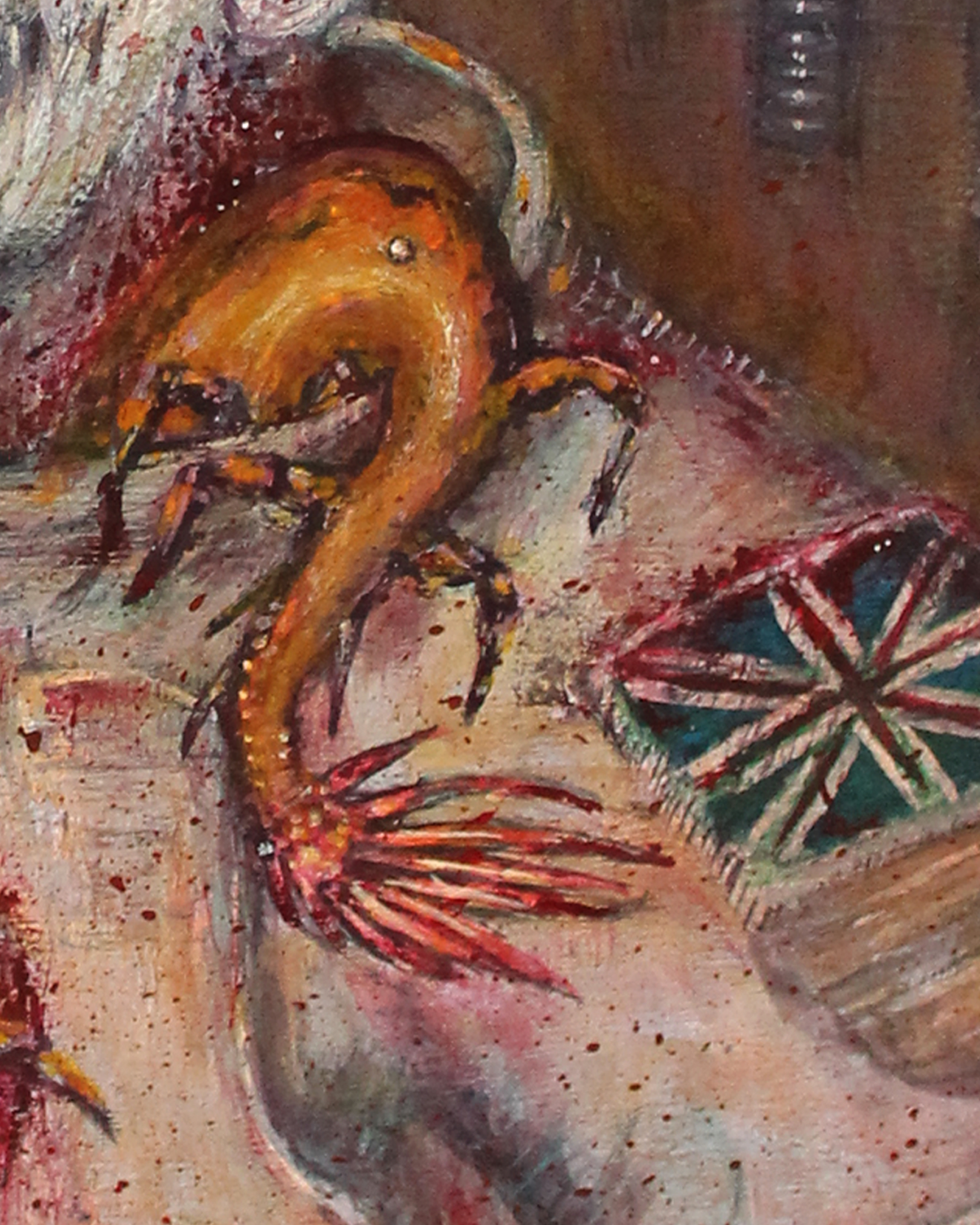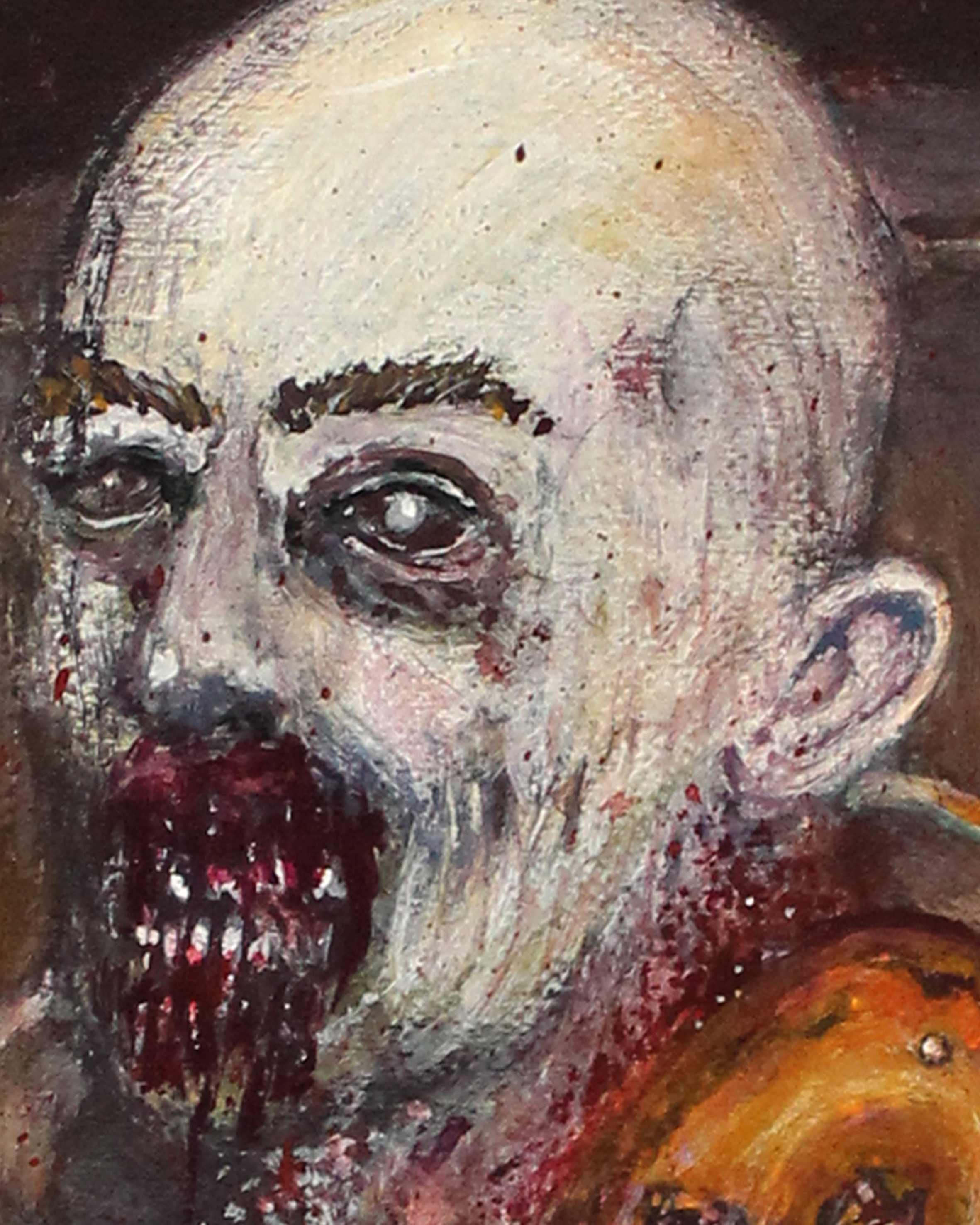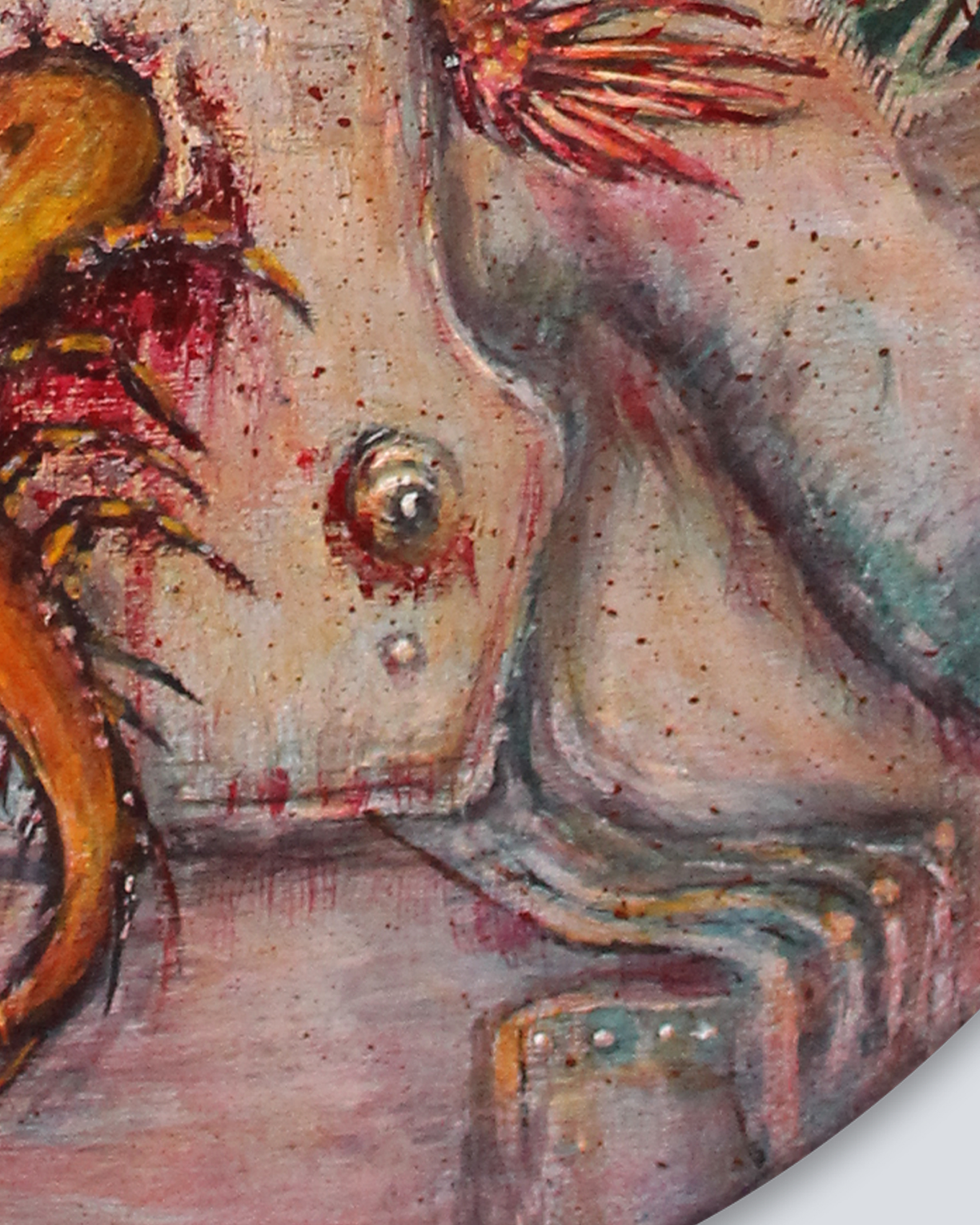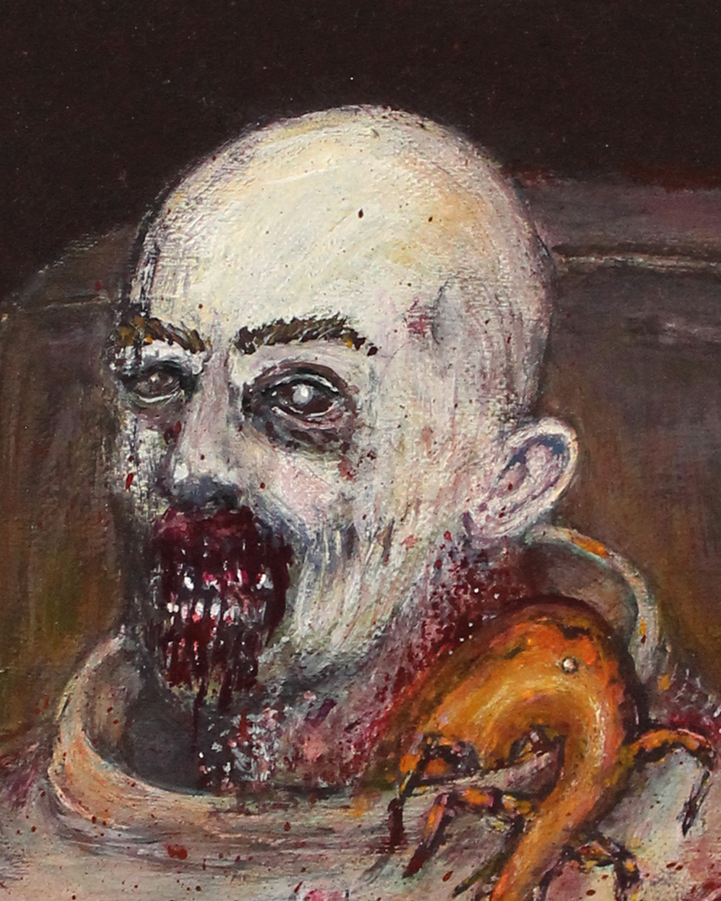 Esta obra pertenece a la serie «Retratos Macabros». Gran parte de mi trabajo está motivado por la incertidumbre y por el miedo. Para este cuadro en particular me inspiré en la canción Space Oddity de David Bowie, donde narra la historia de un astronauta que pierde contacto con la Tierra y queda varado en el espacio. Mi imaginación me llevó a pensar en los últimos segundos de cualquier persona antes de morir, el vacío y la soledad que cualquiera podría experimentar en ese viaje donde no hay retorno. Por otra parte, en ese tiempo de mi vida enfermé del estómago y en esos momentos me parecía muy grave, no podía dormir, o comer, y la necesidad me llamaba cada hora, posiblemente un parásito, pensé. Afortunadamente, con la ayuda de medicamentos y un buen diagnóstico salí adelante y con una pintura de por medio.